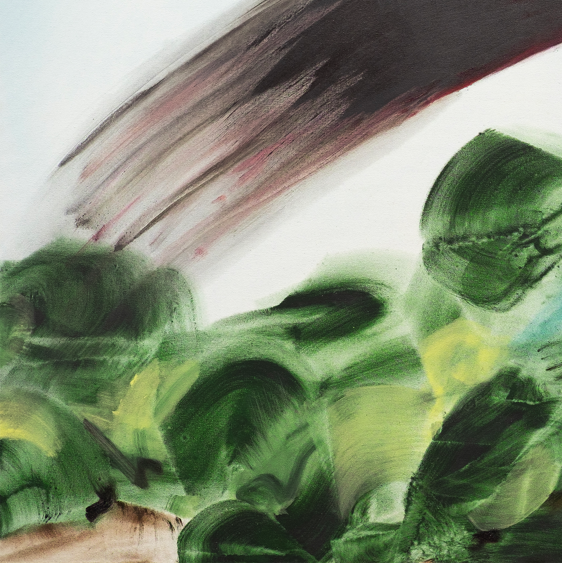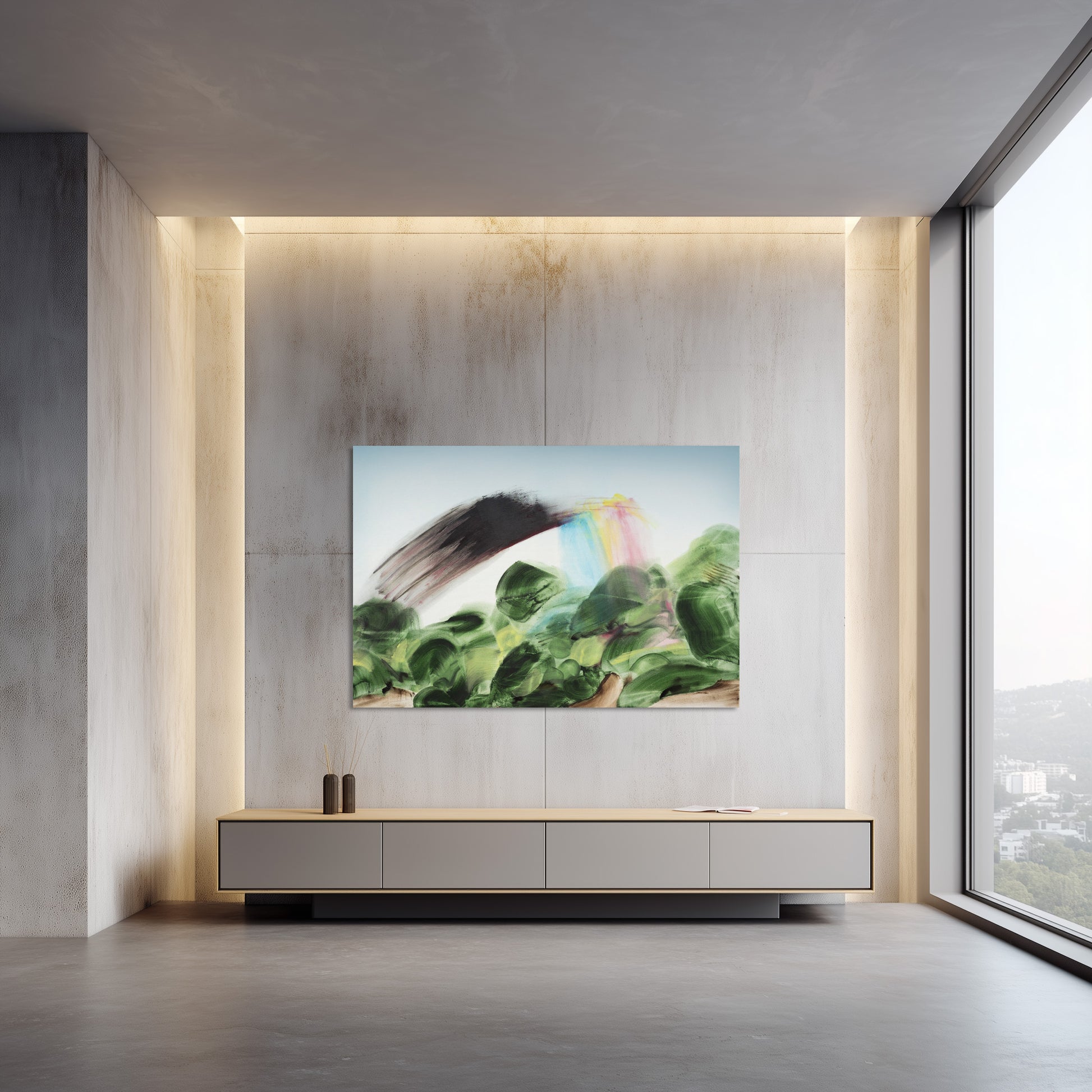Across the horizon, over a folding landscape a rainbow is violently slashed, its arc severed in a vicious moment of fragile intensity.